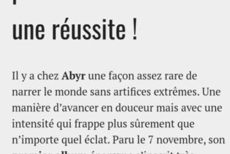 Pour découvrir d’autres articles récents sur le 1er album d’Abyr, cliquez sur les liens colorés suivants : On fait quoi ce soir, interwiew d’Abyr dans Culture Mode San, interview dans Mes Infos, interview vidéo dans Affiches Parisiennes.